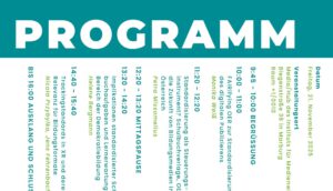 - AG-Workshop 2025Am 21. November 2025 findet am Media/Hub des Instituts für Medienwissenschaft an der Philipps-Universität Marburg unser AG-Workshop zum Thema Standardisierung und Bildungsmedien. Von Schulbuchverlagen bis APIs statt. Organisiert wird der Workshop von Nicola Przybylka, Andreas Weich und Monika Weiß.Eine Anmeldung ist bis zum 17.… Weiterlesen »AG-Workshop 2025
